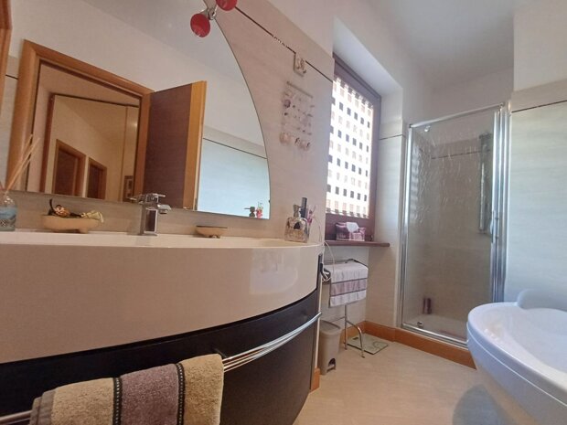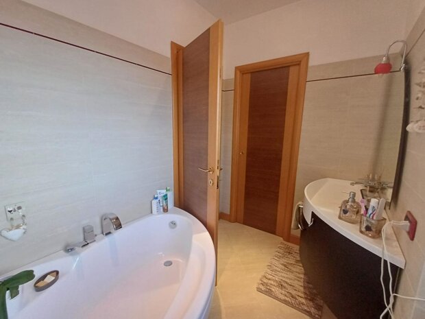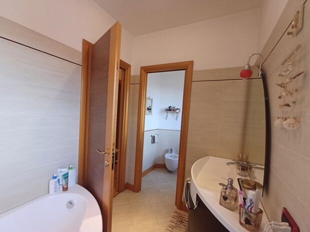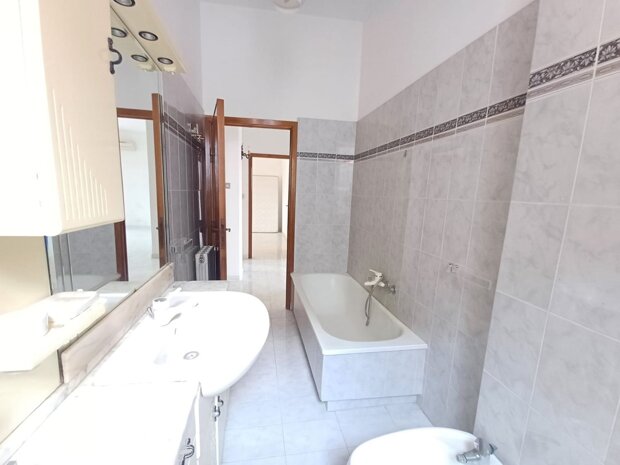 GRANDE BAGNO SUDDIVISO IN 2 ZONE , UNA LAVELLO, VASCA E DOCCIA , E L' ALTRA ZONA SERVIZI, ENTRAMBE FINESTRATE.